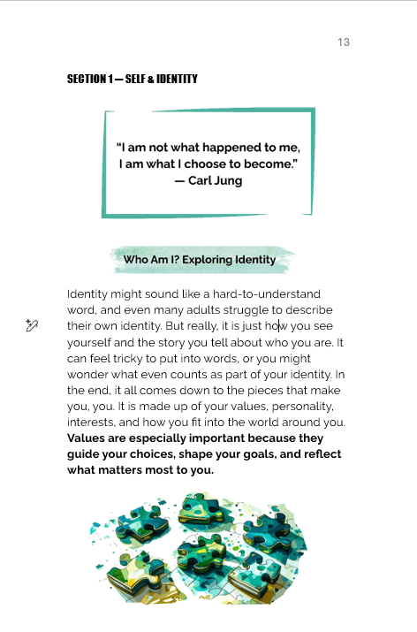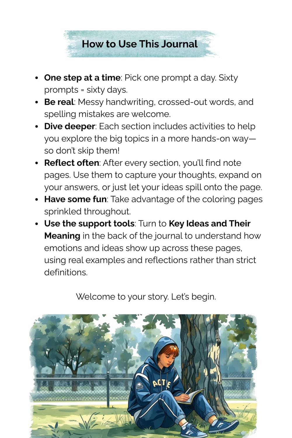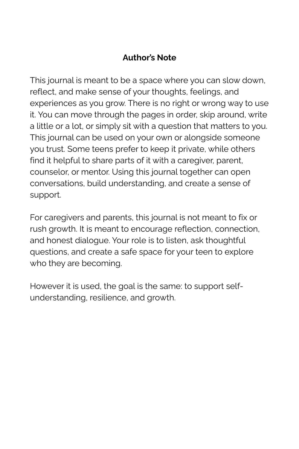 Organized into five progressive sections—Self & Identity, Friends & Community, Love & Relationships, School, Work & Future, and Meaning & Big Picture—the journal guides teens through the core areas shaping their daily lives. Activities explore topics such as anxiety, belonging, emotional safety, boundaries, resilience, confidence, goal setting, and purpose, while reflection questions encourage honesty, self-compassion, and critical thinking.